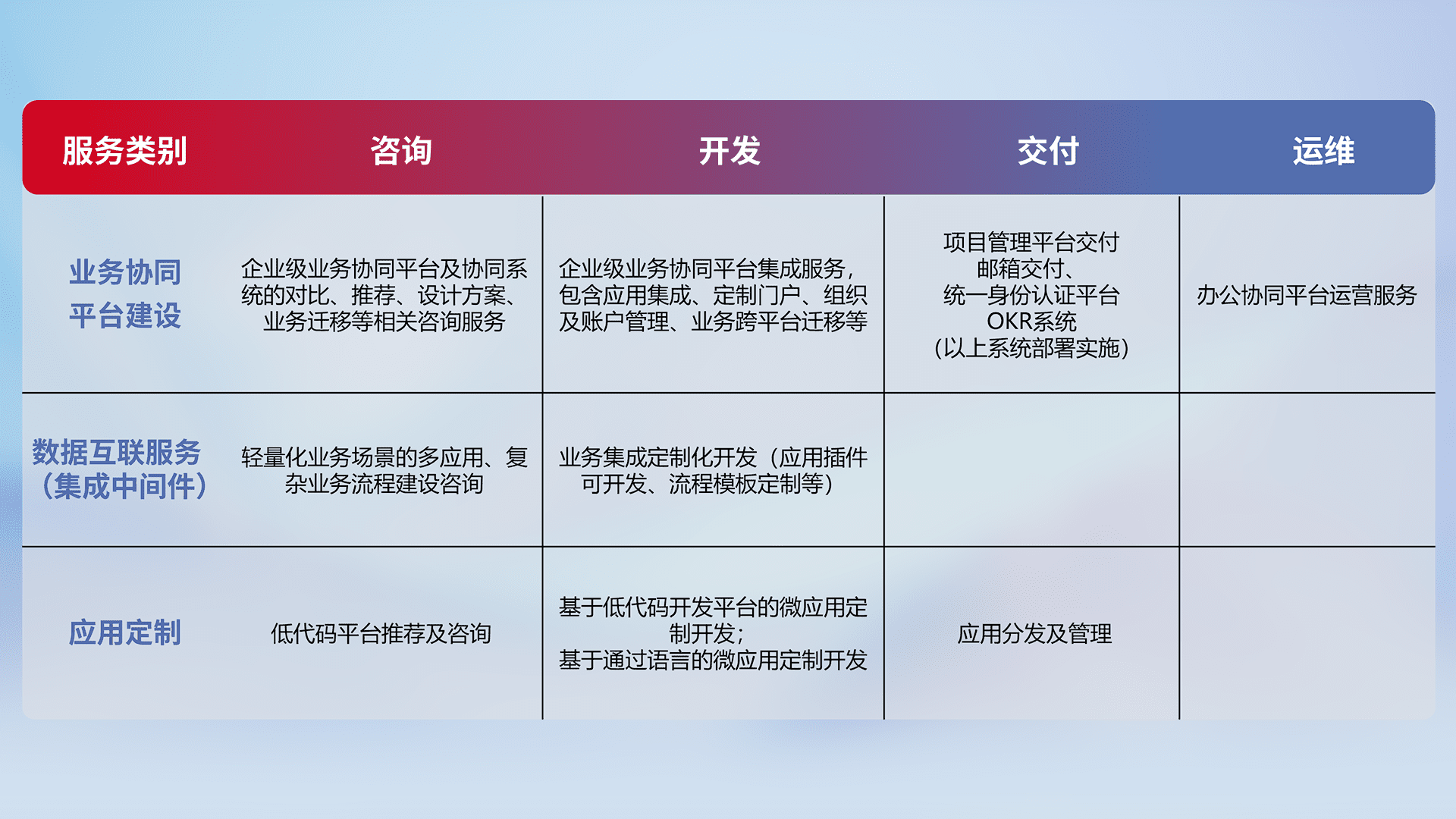 针对钉钉、、、企微、、、、IDaas等平台级产品提供产品的规划、、、、方案、、交付、、定制化开发等服务,,,实现如统一协同办公、、、智能客户服务、、、、混合会议管理、、、、智能数据查询、、、、等业务场景,,,实现数字化转型。。。