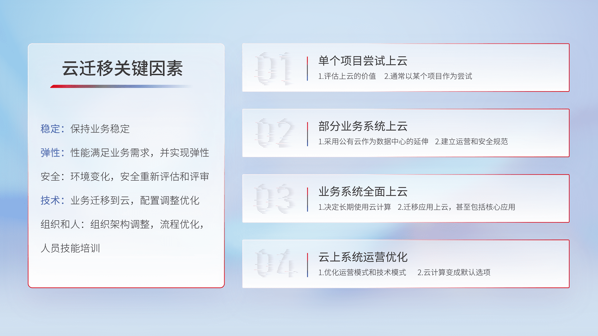 结合实际业务,,从规划设计、、、云平台选型、、、、云原生改造、、数据迁移、、、集成交付,,迁移全过程为客户识别最佳上云路径,,,做好风险识别管理,,,,设计网络架构、、身份权限、、安全审计合规、、、、操作审计、、、、日志审计、、、、监控告警策略、、多站点容灾设计等,,,对云上基础设施进行整体规划,,提升IT治理水平,,以满足弹性、、、、高可用、、高性能的需求。。