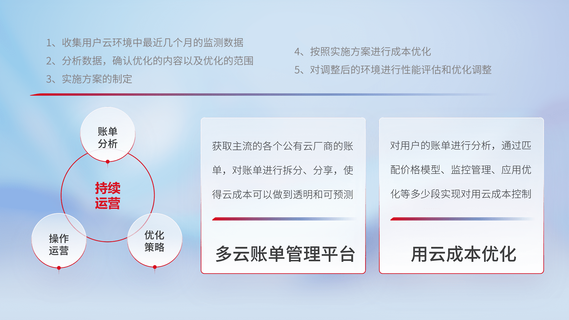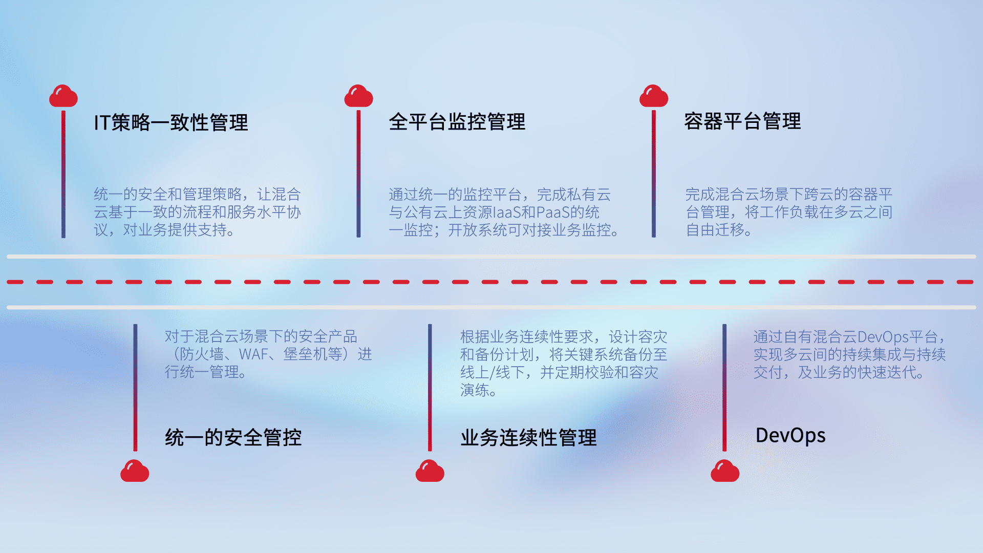 通过多云纳管,,以统一的资源数据模型把客户的云资源进行抽象和封装,,,,进而实现对多云资源的统一操作,,,,保障云资源管理的可靠性、、、、稳定性与可用性。。。。量身定制化运维内容,,配置、、开发运维、、、补丁管理、、备份、、监控、、、认证和访问管理、、、、审计和日常巡检等,,,,保障在用云过程中的可靠度,,,,稳定度以及高可用率。。